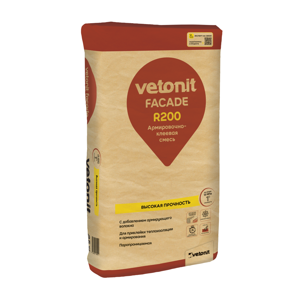 Vetonit facade R200 - армировочно-клеевая смесь для монтажа теплоизоляции и создания базового штукатурного армированного слоя в СФТК. Содержит в себе армирующее волокно, обладает высокой прочностью на сжатие не менее 13 Мпа. Высокие прочностные характеристики обеспечивают надежный и долговечный результат! Смесь идеально подходит для использования в фасадной системе vetonit с облицовкой клинкерной плитой в качестве декоративного слоя. Продукт обладает отличной паропроницаемостью. Для монтажа теплоизоляции и создания базового штукатурного армированного слоя в системах фасадного утепления vetonit.