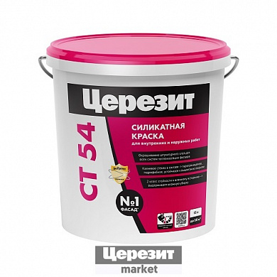 Ceresit CT 54 (Церезит CT 54) - силикатная краска на водно-дисперсионной основе для проведения наружных и внутренних работ. Большим достоинством краски является ее устойчивость к образованию различного рода грибков (плесени) и паропроницаемость, повышающие ее долговечность и улучшающие потребительские характеристики.