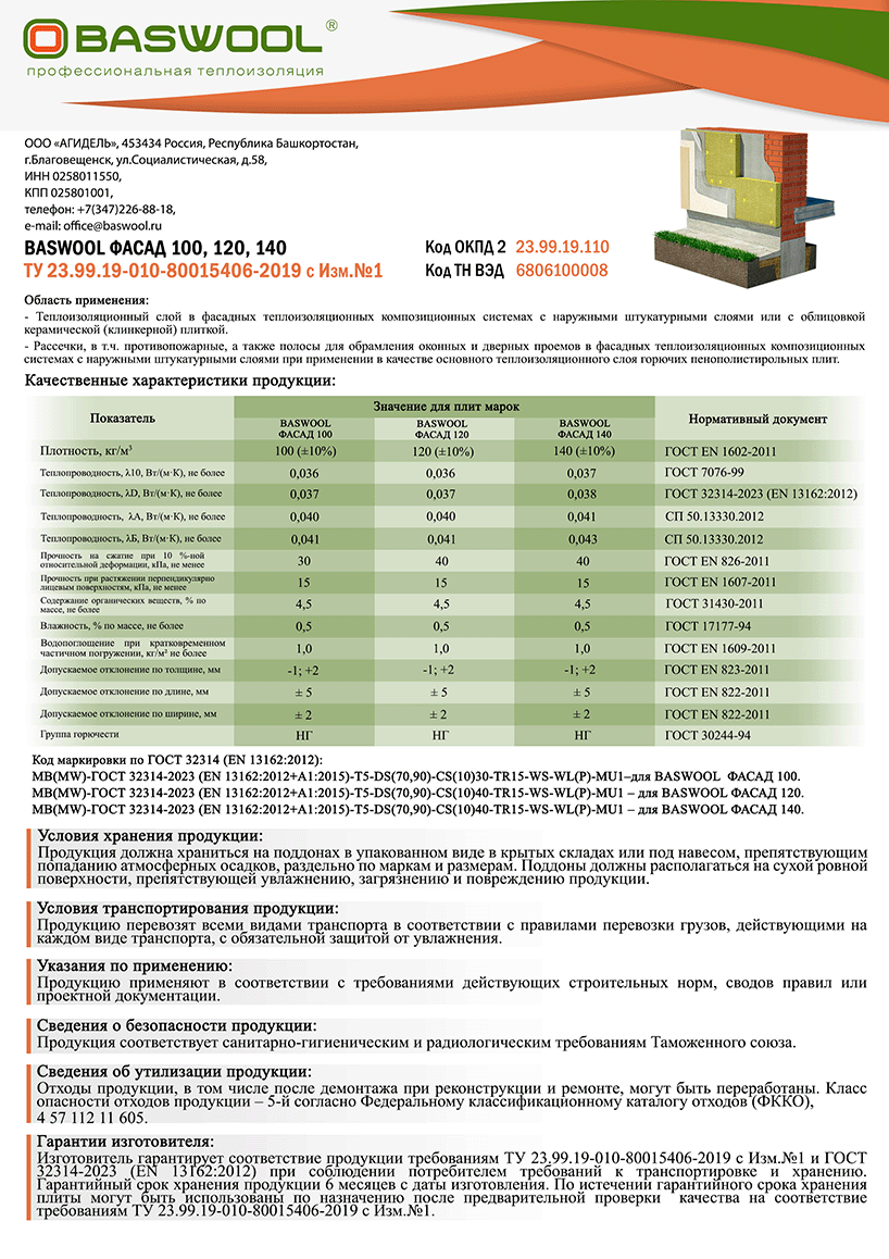 BASWOOL ФАСАД 120 (1200*600*100, 0.216 куб м) применяется в гражданском строительстве в качестве теплоизоляционного слоя в системах наружного утепления фасадов с последующим оштукатуриванием.