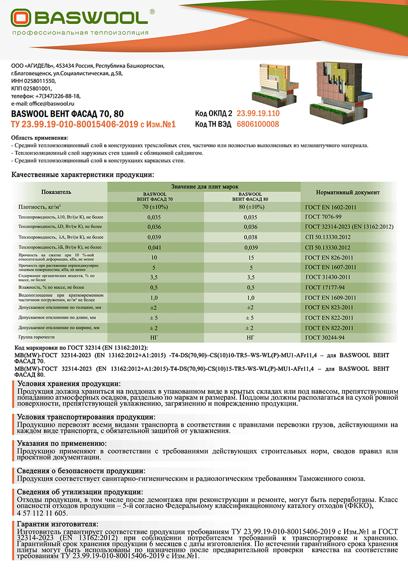 Утеплитель для стен BASWOOL Вент 80 (1200*600*100, 0.216 куб м) Теплоизоляционный слой при однослойном выполнении изоляции в навесных фасадных системах с воздушным зазором. Наружный теплоизоляционный слой при двухслойном выполнении изоляции в навесных фасадных системах с воздушным зазором.